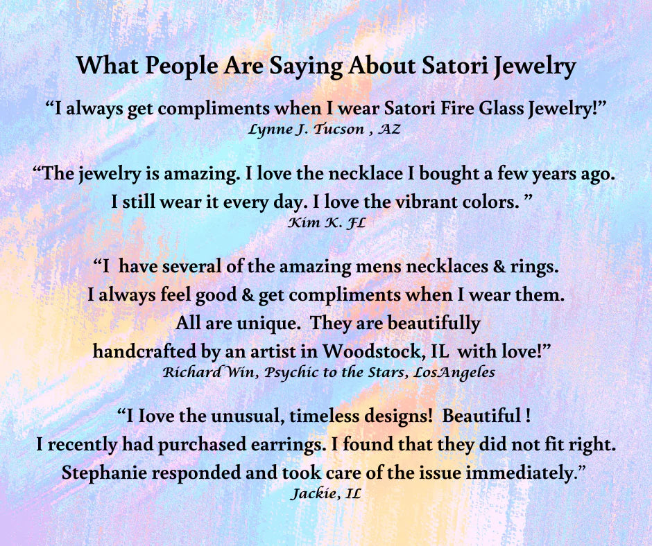 Due to the nature of the glass and processes, each piece becomes a unique jewel reflecting luminescent colors in the light. It is designed to be worn with the most casual to formal attire. Enjoy, Stephanie