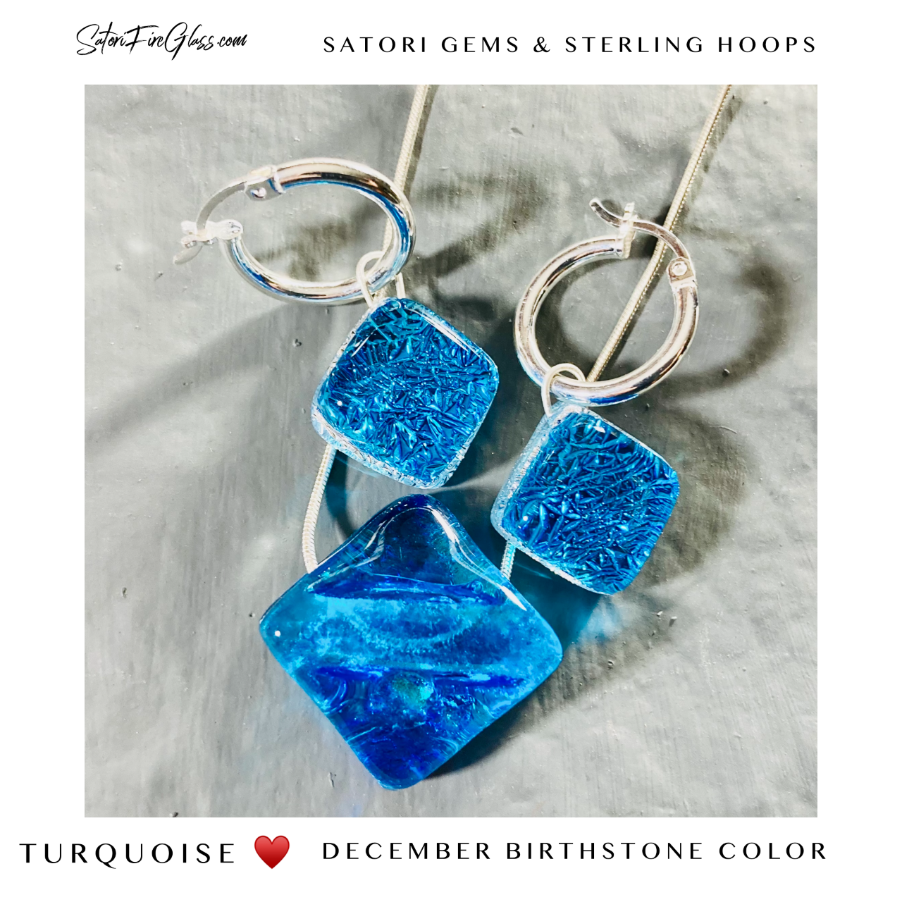 Organic Gem Set includes necklace with an 18" sterling silver chain & sterling silver hoops earrings of the same color.