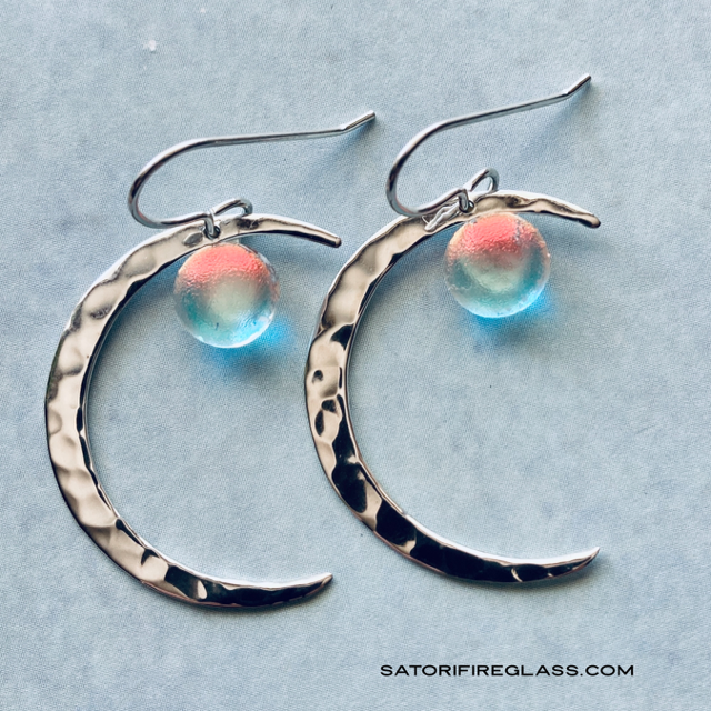 Satori Fire Lights on Hammered Silver Crescent Moon Earrings w/ Sterling Ear Wires